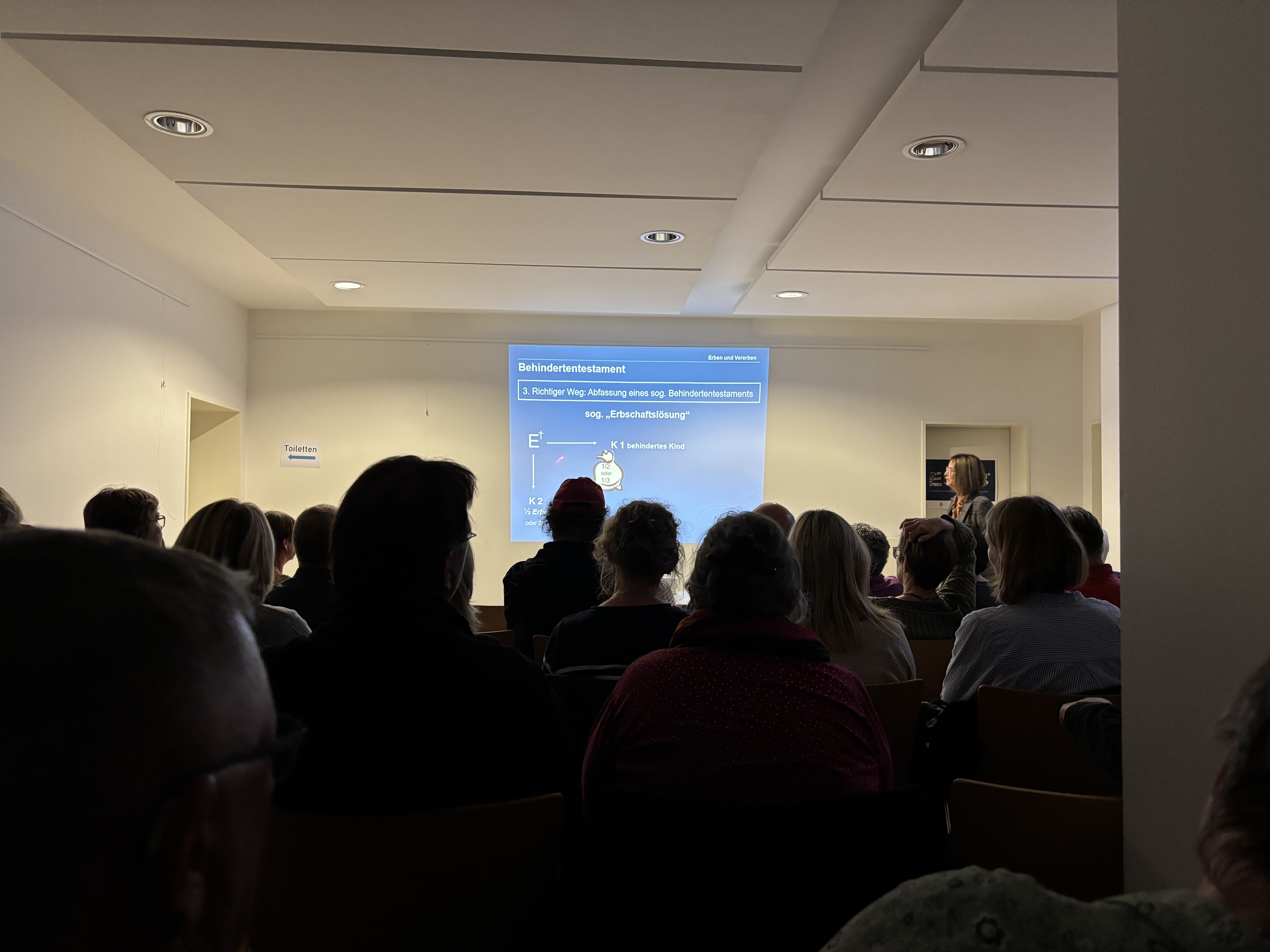 Am 13. November 2025 fand um 18:30 Uhr im FREIraum der Fritz-Berger-Stiftung ein Vortrag zum Thema „Behindertentestament” statt. Die Fachanwältin Ruth Mundanjohl von der Kanzlei Am Wasserturm in Mannheim referierte über die Gestaltung eines Behindertentestaments. Nach einer Einführung in die allgemeinen Erbfolgen wurde erläutert, worauf bei der Gestaltung eines Behindertentestaments zu achten ist. Das Ziel eines solchen Testaments besteht darin, zu verhindern, dass Menschen mit Behinderung, die Sozialleistungen erhalten, zu Selbstzahlern werden, wenn beide Elternteile versterben. Denn eine Erbschaft stellt nach dem Sozialhilferecht verwertbares Einkommen dar, sobald die Einkommens- und Vermögensgrenzen überschritten werden.